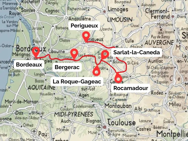Route: Bordeaux – Bergerac – La Roque-Gageac – Sarlat-la-CanĂ©da – Rocamadour – PĂ©rigueux