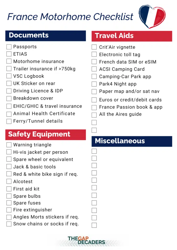 France Motorhome Checklist