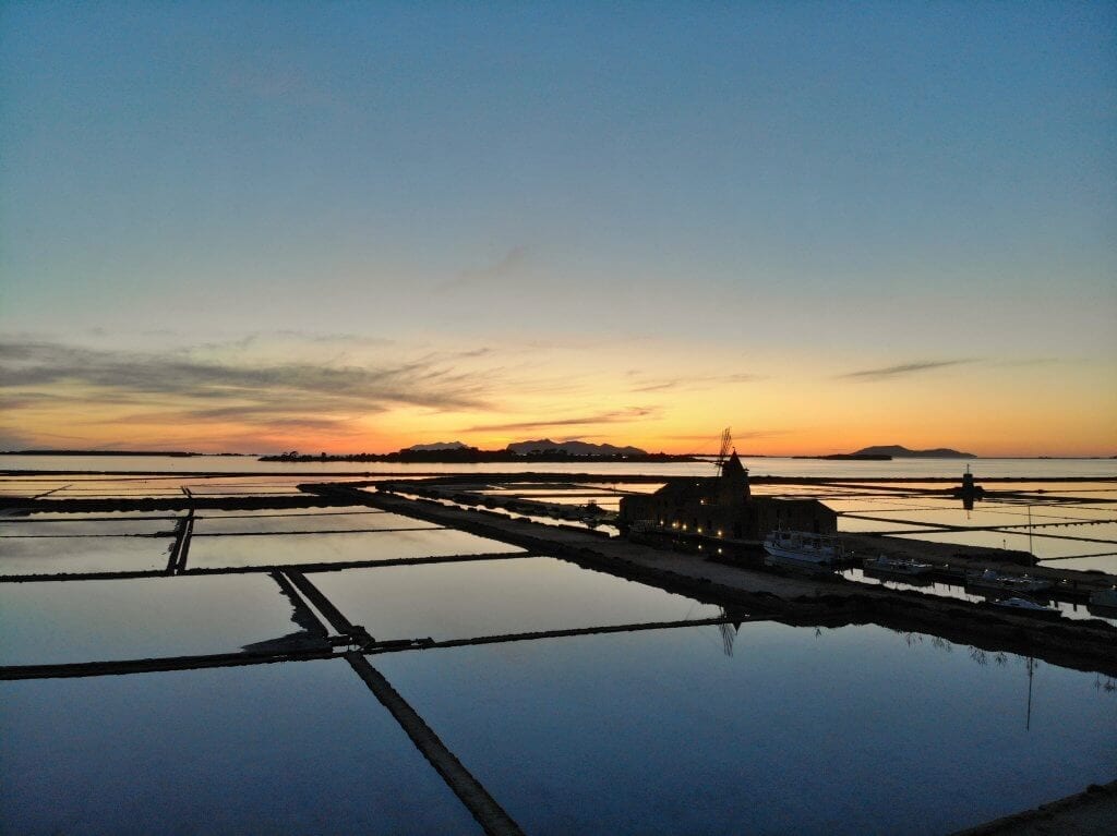 We took this amazing image of the Marsala salt pans at dusk from our wild camping spot literally over the road! Â A coach park by day which welcomes motorhomes for no charge overnight. This is unusual in Sicily where you are often asked to pay ‘protection money’. Â